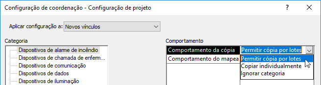 Antes ou ao copiar conexões a partir de um modelo vinculado para um modelo MEP, especifique um comportamento de cópia para cada categoria de conexão na caixa de diálogo Especificar as configurações de coordenação.