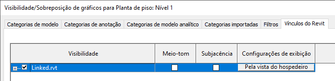 Para especificar que um filtro e outras substituições gráficas aplicados a uma vista do modelo hospedeiro devam também ser aplicados a modelos vinculados e modelos aninhados na vista, use a configuração Por vista de hospedeiro (o padrão).