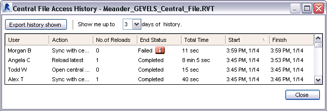 A caixa de diálogo Histórico exibe as informações sobre cada ação envolvendo o arquivo central para o projeto Revit. Se a operação de acesso ao arquivo central falhou, clique em para obter informações sobre a falha. Consulte Se uma operação Sincronizar com o arquivo central falhar
