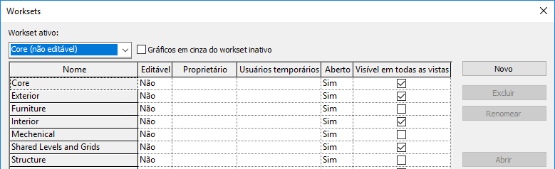 Esta configuração global define o comportamento padrão para cada workset nas vistas de projeto. É possível substituir a visibilidade de cada workset para vistas individuais.