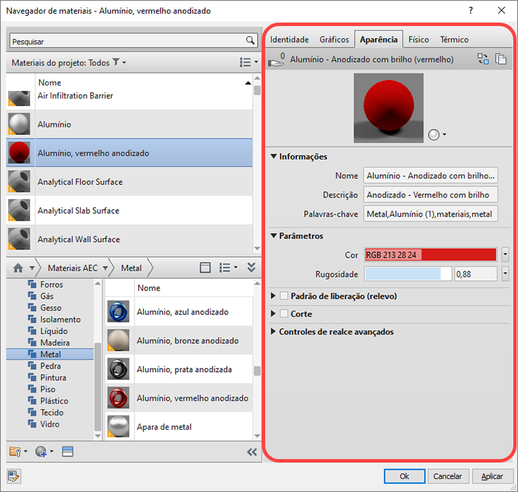 O Revit LT suporta o uso de materiais para definir gráficos de elementos em vistas de projetos e aparências realistas em imagens renderizadas, assim como as informações gerais sobre o material.
