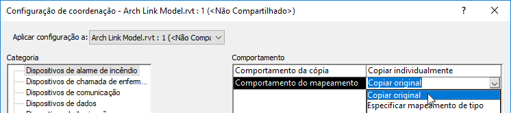 Antes ou ao copiar conexões a partir de um modelo vinculado para um modelo MEP, especifique um comportamento de mapeamento para cada categoria de conexão na caixa de diálogo Especificar as configurações de coordenação.