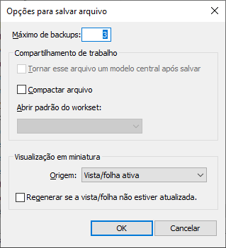 Por padrão, o Revit salva até três arquivos de backup para cada projeto. É possível alterar o número de arquivos de backup que o Revit salva para um projeto.
