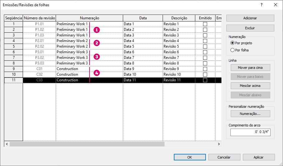 Na imagem, você vê como o esquema de nomenclatura de revisão descrito anteriormente é criado no Revit. Cada uma das fases preliminares do projeto obtém uma sequência numérica, ,