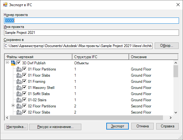 Выбираемые для экспорта внешние ссылки в файле проекта и способ их отображения в IFC-файле контролируются путем принятия стандартных назначений уровней или посредством указания другой метки. Все чертежи, назначенные одной и той же структуре IFC, экспортируются в IfcBuildingStorey в файле IFC.