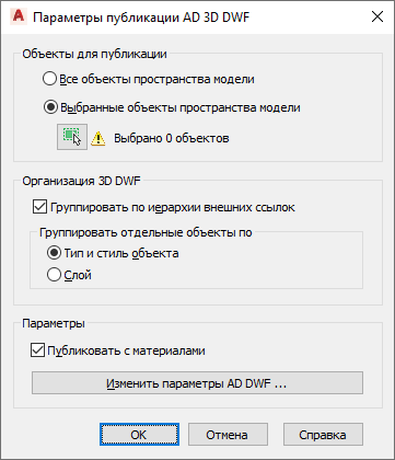 В результате будут публиковаться все автоматически задаваемые свойства, связанные с объектами, выбранными для экспорта в DWF- или DWFx-файл.