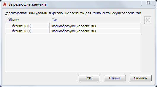 Прим.: Это диалоговое окно также используется для удаления вырезающего элемента посредством нажатия правой кнопки мыши на ячейке "Объект" или "Тип" и выбора "Удалить". Альтернативный способ - использование контекстного меню несущего элемента. При удалении вырезающего элемента происходит удаление связи несущего элемента с объектом, который использовался для создания этого элемента. Сам объект не удаляется из чертежа.