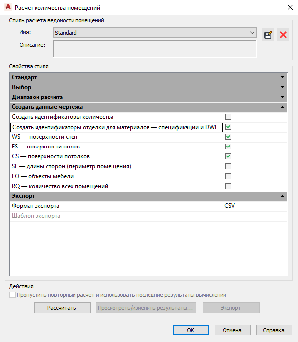 - В диалоговом окне "Расчет количественных характеристик помещения" в разделе "Свойства стиля" в списке "Создать данные чертежа" выберите "Создать идентификаторы отделки для каждого материала".
