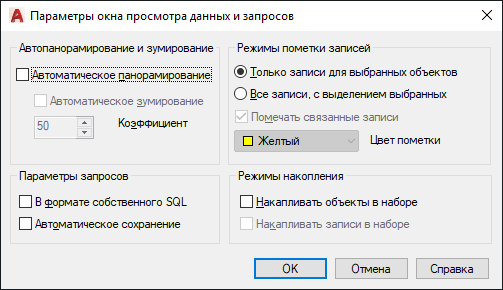 Для задания различных режимов просмотра связанных графических объектов и записей используется диалоговое окно "Параметры окна просмотра данных и запросов".