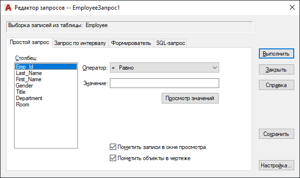 Позволяет формировать простейшие запросы, осуществляющие отбор записей по одному столбцу, одному значению и с использованием одного оператора.