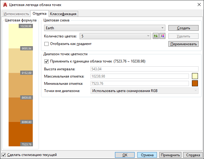 Редактирование параметров цветовой схемы для стилизации облака точек по отметке.