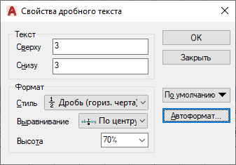 Определяет формат стиля для текста в виде обыкновенной дроби: дробь с горизонтальной чертой, дробь с косой чертой, допуск или допуск с выравниванием по десятичному разделителю.