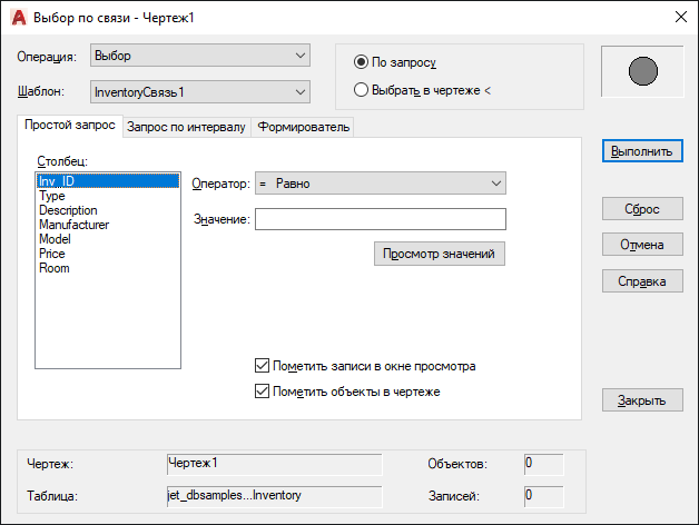 Здесь отображается статусная информация о текущей операции выбора по связи. Выводятся имена текущего чертежа и таблицы, количество объектов и записей, удовлетворяющих заданным критериям.
