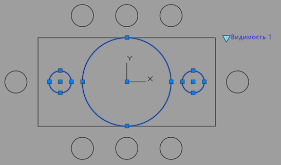 С помощью состояний видимости можно создать блок с любым количеством различных конфигураций. В этом примере рассматривается создание блока, который может представлять собой либо круглый стол с четырьмя стульями, либо прямоугольный стол с восемью стульями.