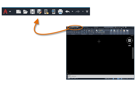 В верхней части окна AutoCAD есть стандартная лента вкладок. На вкладке "Главная" можно получить доступ практически ко всем командам, представленным в этом руководстве. Кроме того, на панели быстрого доступа, показанной на иллюстрации ниже, есть значки популярных команд, таких как «Создать», «Открыть», «Сохранить», «Печать» и «Отменить».