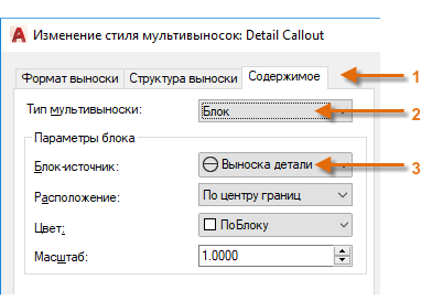 Например, для создания стиля выносного элемента запустите команду МВЫНОСКАСТИЛЬ. В Диспетчере стилей мультивыносок нажмите "Создать" и выберите описательное имя для нового стиля мультивыноски. Щелкните вкладку "Содержимое", выберите "Блок", а затем — "Выноска детали", как показано на рисунке.