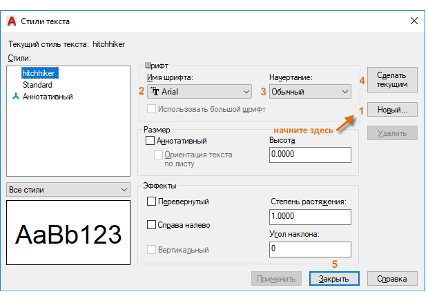При создании стиля текста необходимо сначала задать его название, а затем выбрать шрифт текста и стиль шрифта. Порядок кнопок для нажатия показан на рисунке ниже: