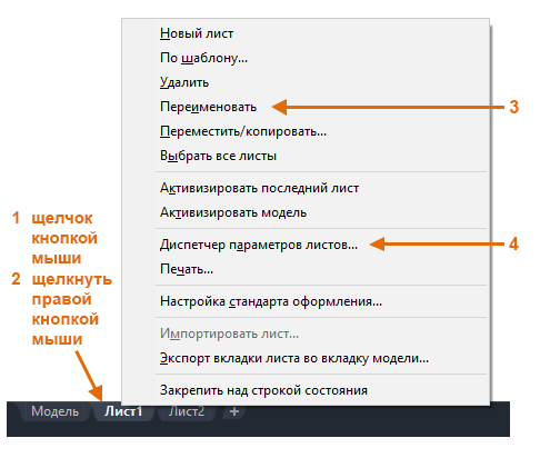 При открытии вкладки листа (1) в первую очередь нужно щелкнуть по ней правой кнопкой мыши (2) и изменить ее имя (3) на что-то более конкретное, чем "Лист 1". Рекомендуется выбирать имена, которые ссылаются на конкретный размер стандартов ANSI или ISO.