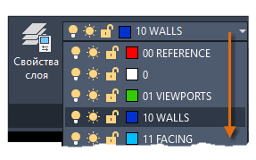 Как показано на рисунке, слой 10 «СТЕНЫ» является текущим. Все новые объекты автоматически размещаются на этом слое. В списке слоев зеленая отметка рядом со слоем 10 "СТЕНЫ" подтверждает использование этого слоя в качестве текущего.
