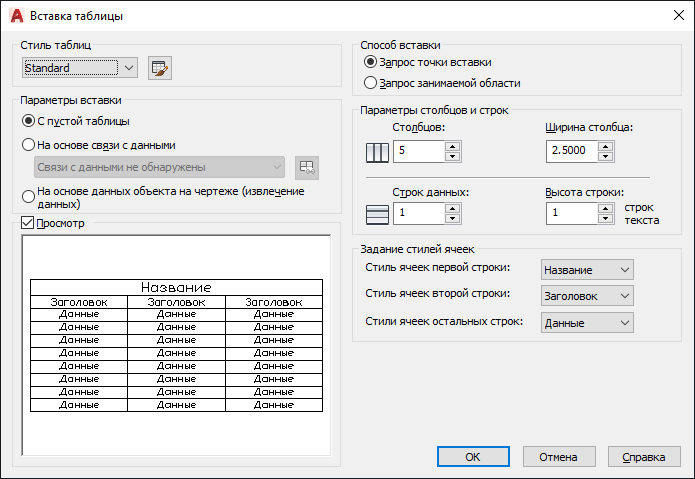 Выберите на текущем чертеже стиль таблиц, на основе которого требуется создать таблицу. Можно создать новый стиль таблиц, нажав кнопку рядом с раскрывающимся списком.