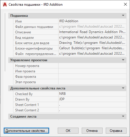 К такой информации относятся путь и имя файла данных подшивки (DST), пути к папкам, содержащим файлы чертежей, относящихся к подшивке, и другие пользовательские свойства подшивки