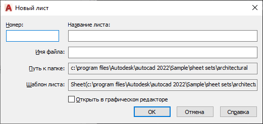 Создание нового листа в текущей подшивке. При этом создается новый файл чертежа (DWG), включающий в себя вкладку-лист с тем же именем, что и сам чертеж.