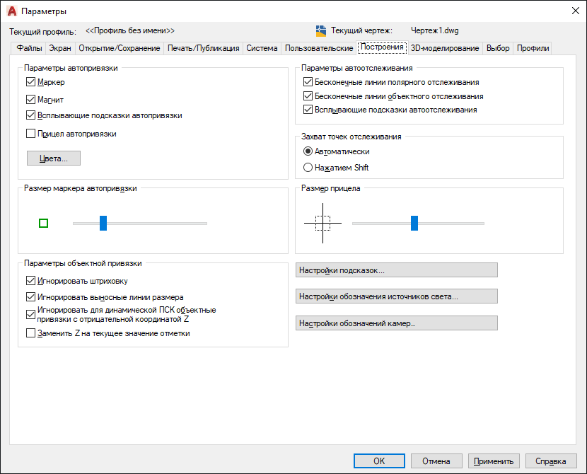 Управление параметрами автоотслеживания (AutoTrack ™ ). Автоотслеживание активизируется при включении полярного или объектного отслеживания (см. описание команды РЕЖИМРИС).