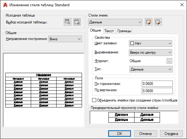 Этот параметр позволяют выбрать на чертеже таблицу для применения в качестве образца при форматировании данного стиля таблиц. После выбора таблицы можно указать элементы структуры и содержимого, которые требуется скопировать из этой таблицы в стиль таблиц.