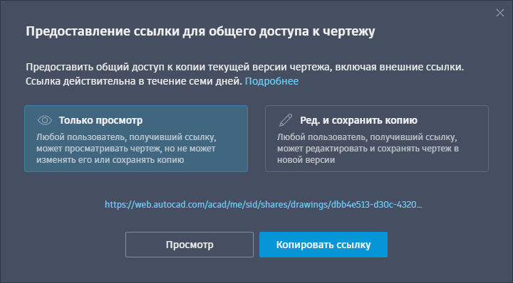 Общий доступ к ссылке на копию текущего чертежа для просмотра или редактирования в веб-приложении AutoCAD. Копия чертежа включает все внешние ссылки и изображения.