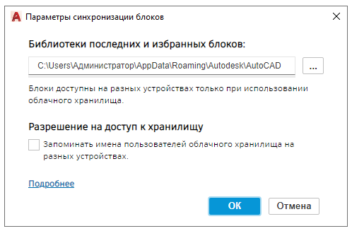 Динамическая кнопка «Параметры синхронизации блоков» в нижней части палитры «Блоки» позволяет определить, были ли недавно использованные и избранные блоки синхронизированы в облачном хранилище.
