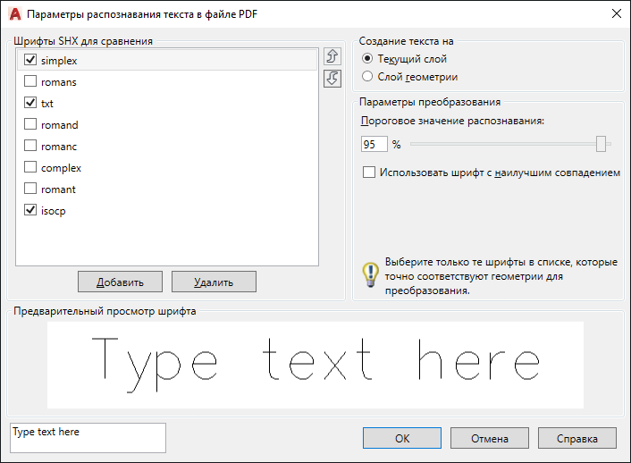 Добавление шрифта SHX в список для сравнения.