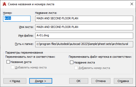 Загрузка данных о следующем листе в диалоговое окно. Данная кнопка облегчает операцию задания нового названия и номера сразу нескольким листам.