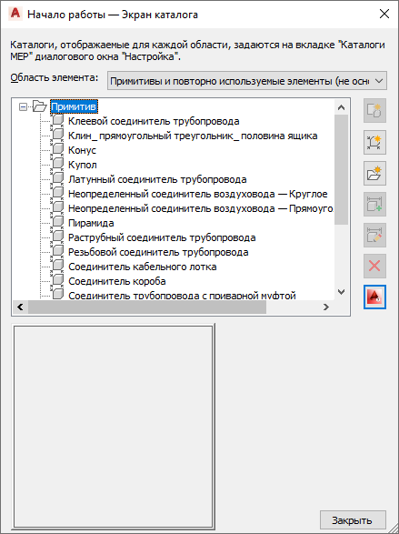 Диалоговое окно "Начало работы — Экран каталога" для примитивов