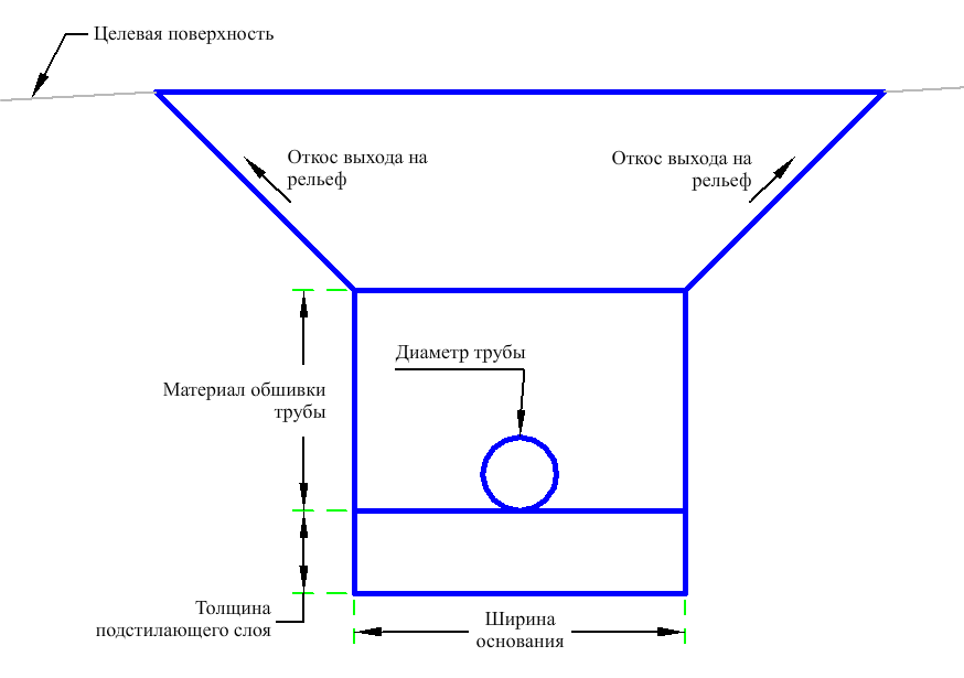 Отметка дна траншеи рассчитывается как отметка линии уклона профиля минус половина диаметра трубы плюс толщина подстилающего слоя. Горизонтальное звено дна траншеи размещается симметрично по отношению к смещению точки присоединения на данной отметке. Толщина материала обшивки трубы используется, чтобы обеспечить наличие материала вокруг трубы. Боковые откосы удлиняются вверх к существующей поверхности. Горизонтальное звено подстилающего слоя располагается на заданной глубине выше дна траншеи.
