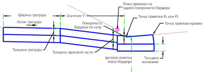 | Точка привязки | Указание точки привязки для бордюра | Кромка/ЗадняяПоверхностьБордюра/Линия стока/Поверхность | Выступ |