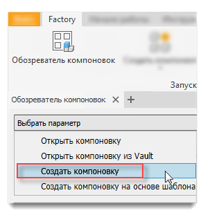 - На ленте Factory выберите панель Запуск Factory > меню Обозреватель компоновок > раскрывающееся меню Выбрать параметр > Создать компоновку.