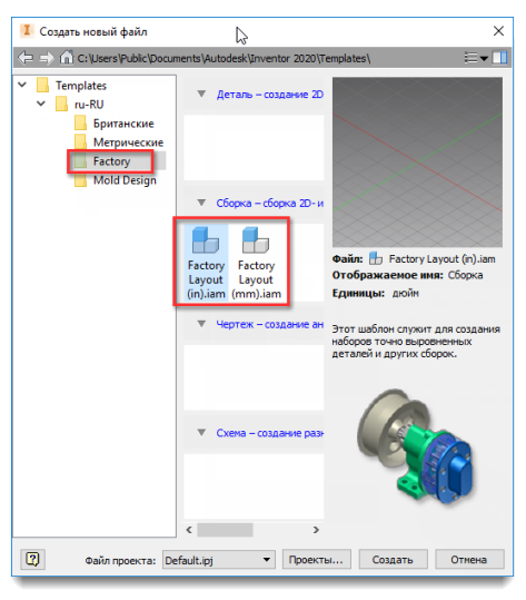 - Перейдите в папку Factory в диалоговом окне Создать новый файл и выберите файл Factory Layout (mm).iam или Factory Layout (in).iam.