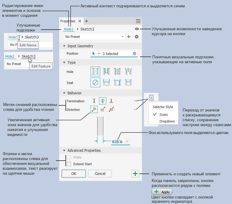 Различные элементы пользовательского интерфейса Inventor обновлены и теперь имеют новое представление.