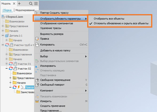Доступ к параметрам «Отобразить все объекты» и «Отложить обновление и скрыть все объекты» теперь можно получить из контекстного меню трассы.