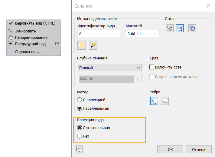 При создании сечения вид по умолчанию выравнивается с родительским видом. С помощью нового контекстного меню «Выровнять вид» можно отключить ортогональную проекцию из базового вида. Кроме того, для управления созданием сечения можно использовать новые параметры проецирования вида в диалоговом окне «Сечение».