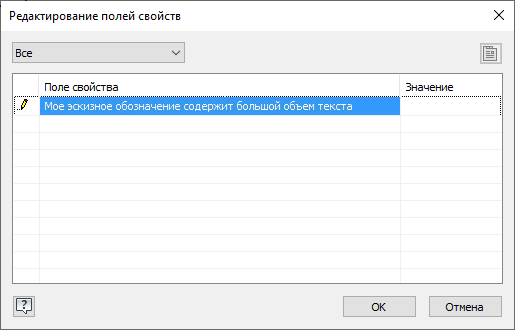 Поля «Свойство» и «Значение» в диалоговом окне «Редактирование полей свойств» теперь автоматически расширяются до размера самой длинной текстовой строки при вставке эскизного обозначения, основной надписи или рамки, содержащей подсказку.