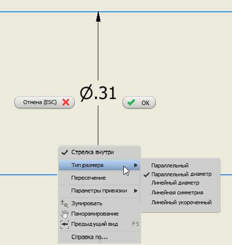 Параллельный диаметр с обозначением Ø — это новый тип размера, который создается при выборе кромки силуэта цилиндрического элемента (вала или отверстия).