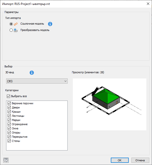 Теперь можно указать категории Revit, которые требуется включить в импортируемую модель или исключить из нее. Для этого следует выбрать 3D-вид и отменить выбор включаемых категорий, а затем импортировать модель.