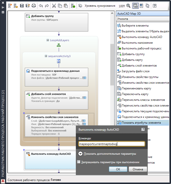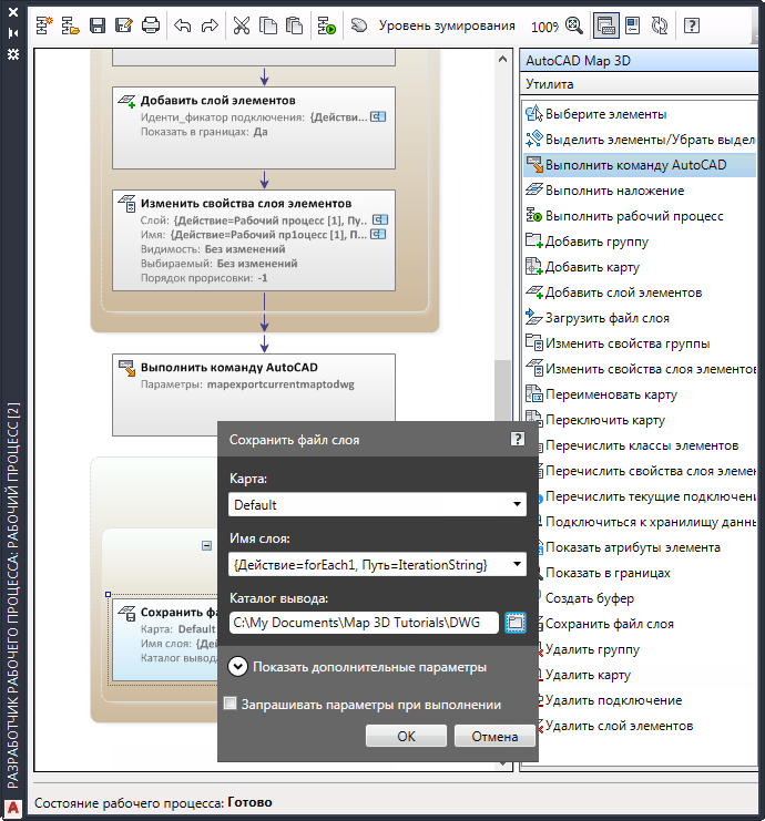 Чтобы завершить определение рабочего процесса, добавьте слои в группу и автоматизируйте выполнение команды AutoCAD. После этого сохраните и протестируйте рабочий процесс.