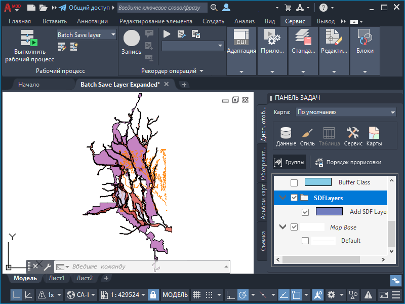 При запуске рабочего процесса в Инструментарий AutoCAD Map 3D выводится список файлов SDF в указанной папке. Затем он создает группу в Диспетчере отображения, в которую будут добавляться создаваемые слои. Выполняется подключение к файлам SDF в указанной папке. Для каждого чертежа в указанной папке устанавливается подключение, добавляется слой в Диспетчер отображения, а слои перемещаются в новую группу.