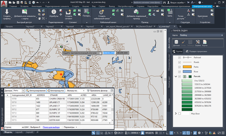 На этой карте есть слои "Диспетчера отображения" для железных дорог, дорог, парков, реки и участков. Каждый из них имеет разный стиль. Основные сведения о разделах окна Инструментарий AutoCAD Map 3D см. в разделе Урок 2. Краткий обзор Инструментарий AutoCAD Map 3D.