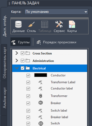 Для организации объектов чертежа используются их реальные характеристики (например, дороги, участки, кабели или системы водоснабжения).