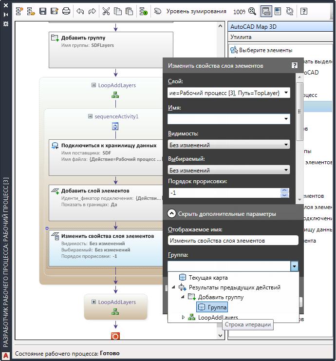 Действие «Повторить добавление слоев» относится к типу «Для каждого» и повторяется для каждого из выбранных элементов. Действия такого типа находятся в наборе инструментов «Утилита».