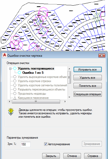 С помощью средств очистки чертежа можно автоматизировать процесс очистки распространенных ошибок рисования и оцифровки, который обычно занимает много времени. Можно удалять повторения, корректировать искажения и свободно расположенные объекты и выполнять другие действия.