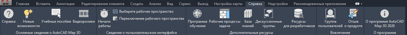 - Справка. Обзор основных понятий и процедур, а также возможность поиска сведений по всем аспектам использования Инструментарий AutoCAD Map 3D.